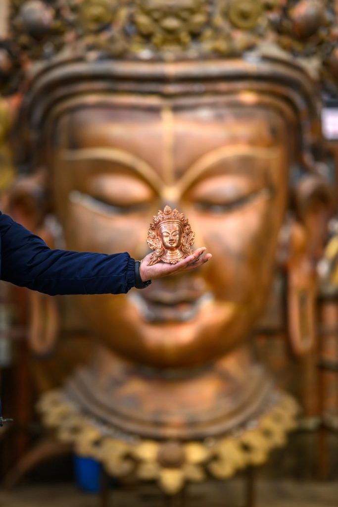 There is a massive construction of a 72 ft X 58 ft X 21 ft repoussé mask taking place at our project site located at Chhampi known as Phishing Phat. Mr Swarup Shakya is continuing the work of this repoussé work where the late Rajkumar Shakya had left off.